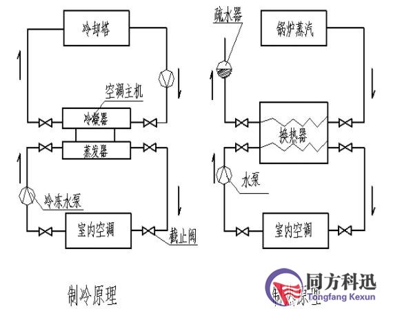 蒸汽經(jīng)換熱后溫度降低,變成冷凝水,由疏水器排出。從而形成制冷循環(huán)。