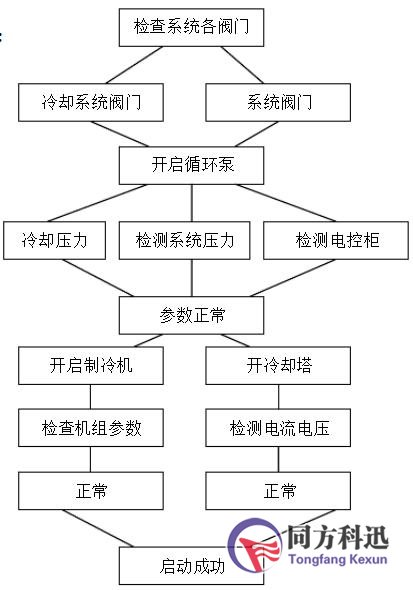 在開(kāi)啟系統(tǒng)之前首先要檢查系統(tǒng)和冷卻水系統(tǒng)閥門是否處于正常開(kāi)關(guān)狀態(tài),無(wú)誤后開(kāi)啟循環(huán)泵,檢測(cè)電流、電壓及冷卻水統(tǒng)水壓是否正常。各項(xiàng)參數(shù)正常后,開(kāi)啟制冷機(jī),檢測(cè)機(jī)組參數(shù),參數(shù)正常后,啟動(dòng)成功。