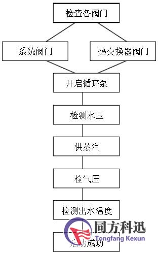閥門,正常后開(kāi)啟循環(huán)泵,檢測(cè)壓力,供蒸氣檢氣壓,出水溫度,啟動(dòng)成功。
